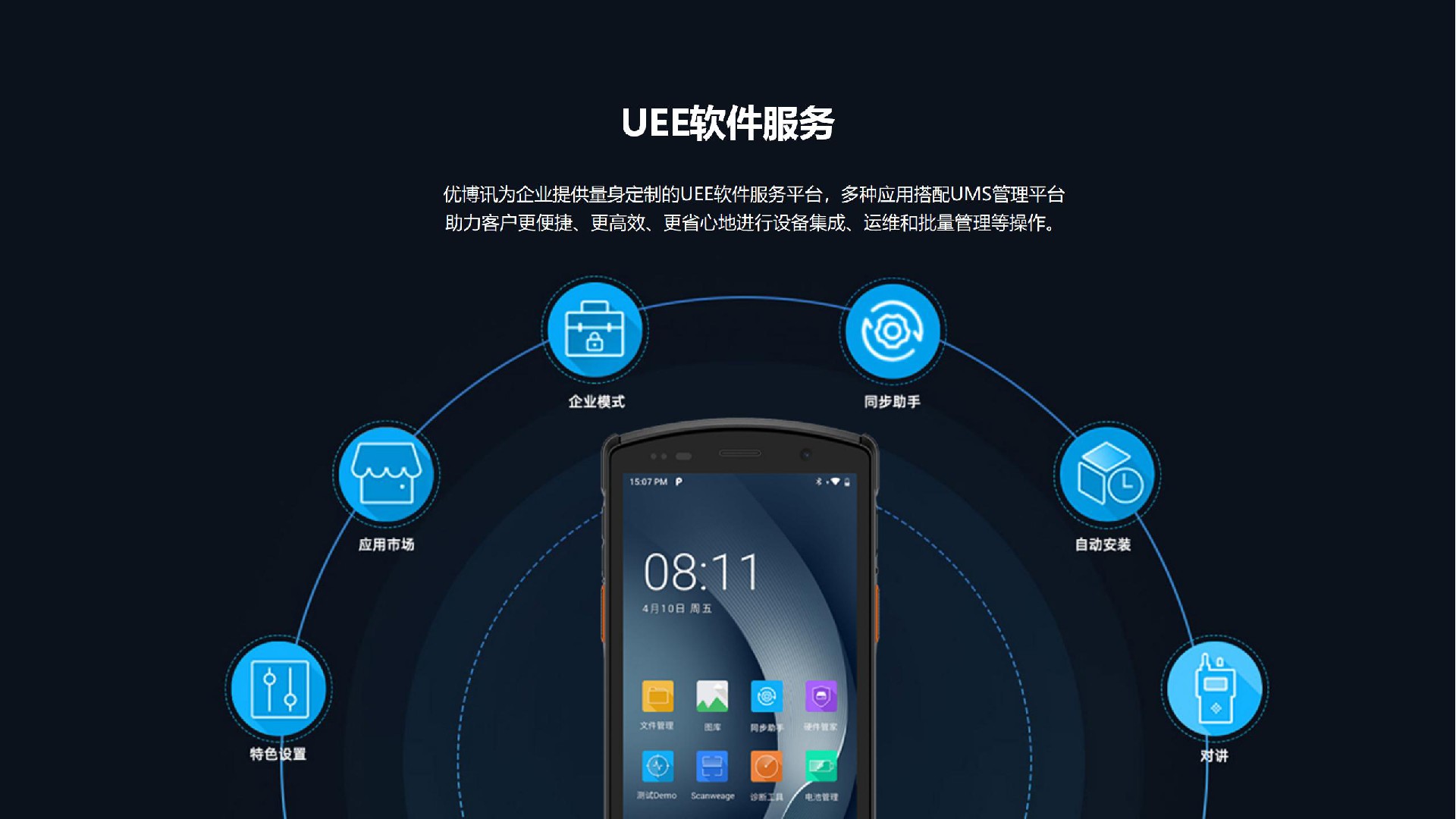 優(yōu)博訊為企業(yè)提供量身定制的UEE軟件服務(wù)平臺(tái),多種應(yīng)用搭配UMS管理平臺(tái)助力客戶更便捷、更高效、更省心地進(jìn)行設(shè)備集成、運(yùn)維和批量管理等操作。
